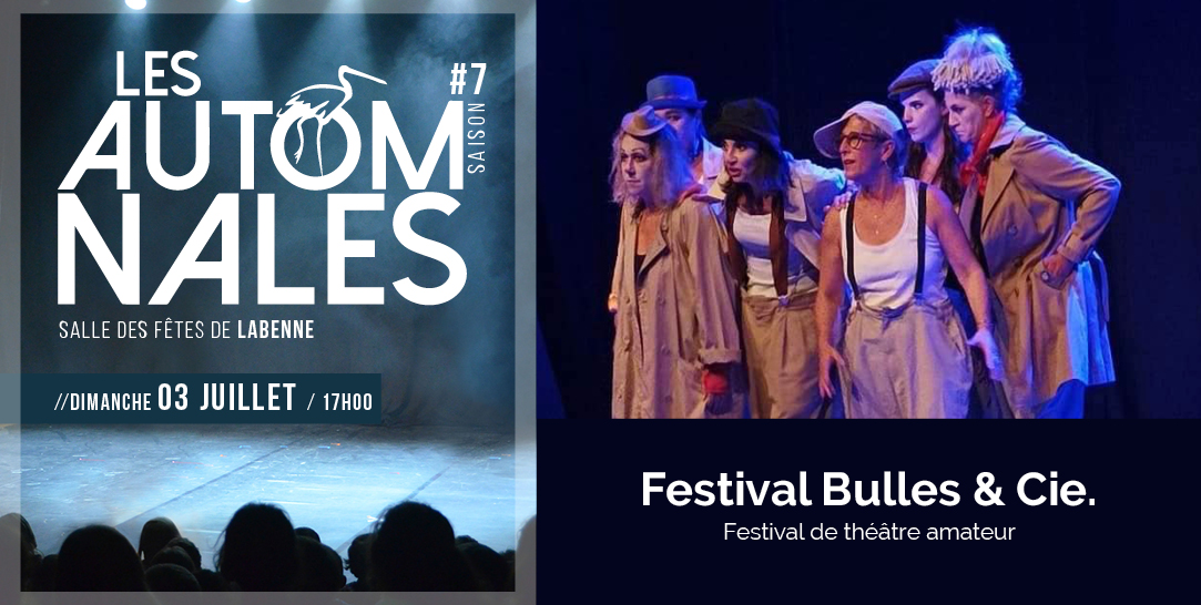 La clôture de la saison des Automnales est confiée cette année encore, à l’association labennaise « Bulles et Compagnie ». Le gros succès rencontré par leur festival, en septembre 2021, nous conforte dans notre démarche d’une programmation locale qui, pas à pas, fidélise son public. Pour la cinquième édition de son festival de théâtre amateur, la troupe est invitée à présenter son travail de l’année dans le cadre de la saison culturelle des « Automnales ».